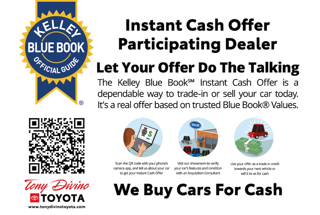 Estimated Monthly Payment will depend on vehicle make and model and will be determined upon actual vehicle inspection. All payments are estimates. Tax, title, registration and documentation fee ($349) are extra. * While every reasonable effort is made to ensure the accuracy of this information, we are not responsible for any errors or omissions contained on these pages. Please verify any information in question with Tony Divino Toyota. Pricing does not include $349.00 Dealer Doc Fee, taxes, licensing and registration.